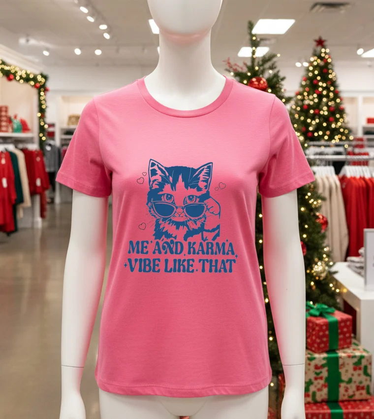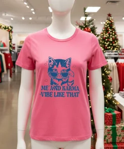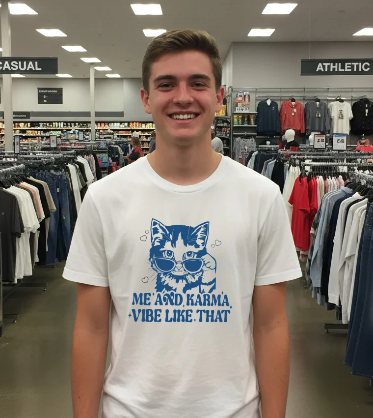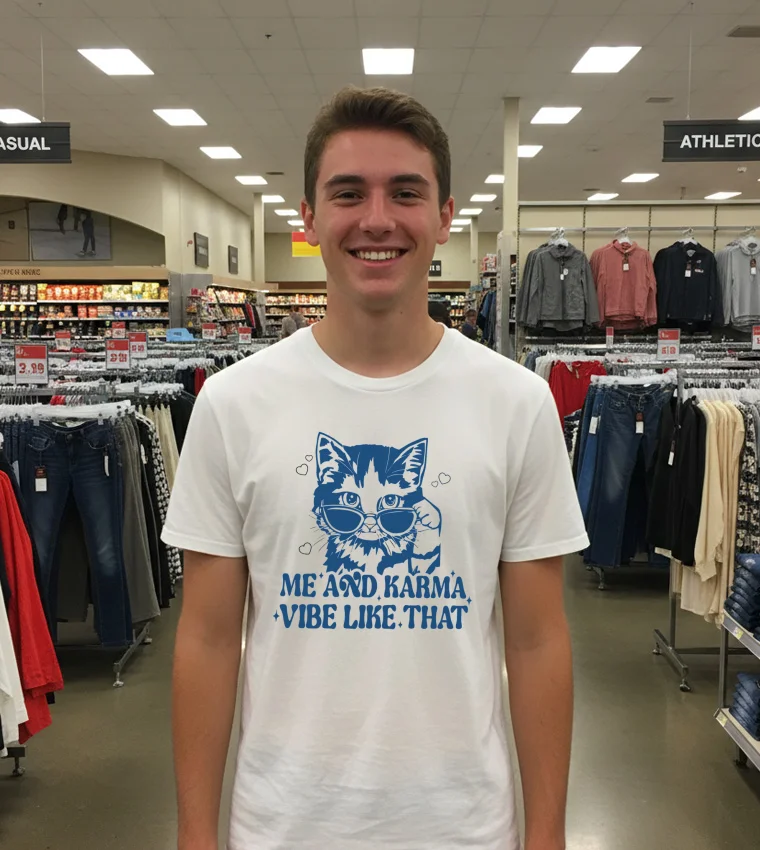 Just last week, while scrolling through my feed, I caught a clip of a local Washington D.C. fashion blogger, Mia Reyes, talking about how “elevated casual wear” is dominating the summer street style scene. She highlighted how graphic tees, especially those with witty or meaningful designs, are perfect for adding personality to an otherwise simple outfit. Immediately, my mind jumped to the Cat Me And Karma Vibe Like That T Shirts. Imagine slipping this on for a relaxed Saturday at the Georgetown Farmers Market, grabbing a gourmet coffee, and then heading over to the National Mall for a casual stroll. You’d fit right in with the “sustainable fashion” vibe many are embracing, pairing it with some vintage-inspired denim or even a flowy, eco-friendly skirt. Or perhaps you’re planning to catch one of the free outdoor concerts at The Wharf, where “gender-neutral apparel” and comfort are key. This shirt isn’t just fabric; it’s a mood, perfect for anyone who embraces a laid-back outlook but still wants to make a subtle, knowing statement. It’s for the person who navigates the bustling D.C. scene with a smile, ready for whatever the day brings, knowing their karma (and their cat!) is always on their side.