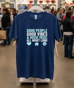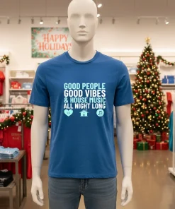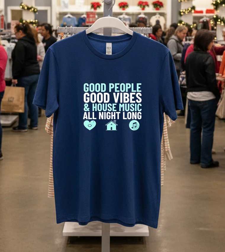 “Absolutely love this shirt! It arrived in just 3 days, even faster than I expected,” raves Maria L. about her recent purchase from Printmuseusa. “The free shipping was a huge bonus, and I always wonder about return policies, but honestly, this Good People Good Vibes House Music All Night Long Shirt is perfect. It’s quickly become my go-to for comfy, cool vibes – a real staple in my wardrobe now!” Our customers feel that joy of quick delivery and the peace of mind knowing they’re getting a quality product they’ll truly love.