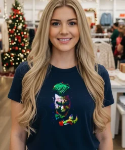 Let’s zoom in on that design, because it’s not just a graphic, it’s a whole mood. The iconic Joker face, merged with the phrase ‘The Laugh Track Dance With The Devil’ – it’s genius. Wearing this isn’t just putting on a shirt; it’s putting on an attitude. It’s a statement that you don’t take life too seriously, that you find humor in the chaos, and you’re not afraid to dance with whatever comes your way. It evokes a sense of pride, a knowing smirk for those who get it. This tee isn’t just an outfit; it’s a conversation starter, a nod to pop culture, and a celebration of your unique psychological makeup. To keep that rebellious spirit alive, remember to wash it inside out in cold water and tumble dry low. Treat it well, and this shirt won’t just be a part of your wardrobe; it’ll be a loyal companion, an extension of your personality, ready for every adventure.